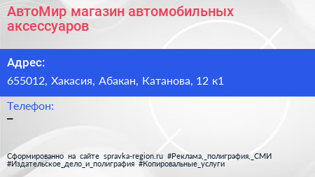 АвтоМир, магазин автомобильных аксессуаров по адресу 655012, Хакасия, Абакан, Катанова, 12 к1 в дальнейшем Организация, размещена в следующих категориях: