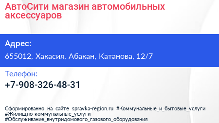 АвтоСити, магазин автомобильных аксессуаров по адресу 655012, Хакасия, Абакан, Катанова, 12/7 в дальнейшем Организация, размещена в следующих категориях: