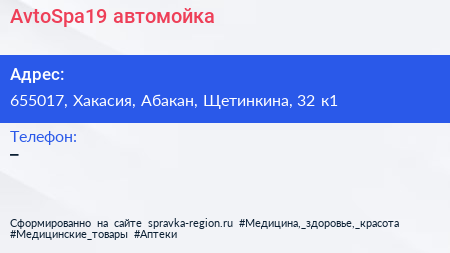 AvtoSpa19, автомойка по адресу 655017, Хакасия, Абакан, Щетинкина, 32 к1 в дальнейшем Организация, размещена в следующих категориях: