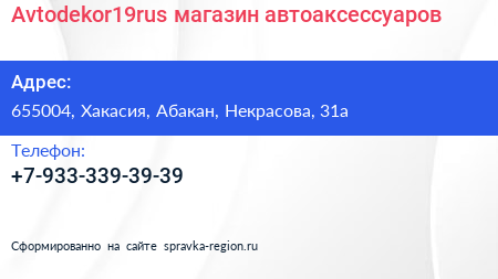 Avtodekor19rus, магазин автоаксессуаров по адресу 655004, Хакасия, Абакан, Некрасова, 31а в дальнейшем Организация, размещена в следующих категориях: