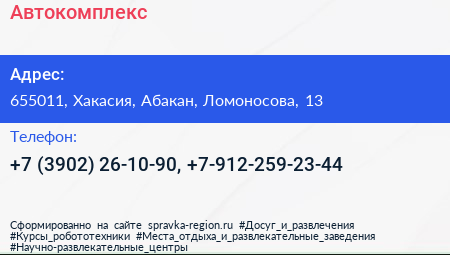 Автокомплекс по адресу 655011, Хакасия, Абакан, Ломоносова, 13 в дальнейшем Организация, размещена в следующих категориях: