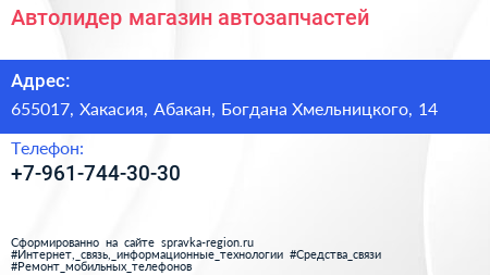 Автолидер, магазин автозапчастей по адресу 655017, Хакасия, Абакан, Богдана Хмельницкого, 14 в дальнейшем Организация, размещена в следующих категориях: