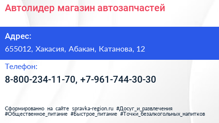 Автолидер, магазин автозапчастей по адресу 655012, Хакасия, Абакан, Катанова, 12 в дальнейшем Организация, размещена в следующих категориях: