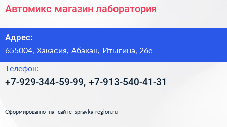 Автомикс, магазин-лаборатория по адресу 655004, Хакасия, Абакан, Итыгина, 26е в дальнейшем Организация, размещена в следующих категориях: