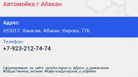 Автомойка, г. Абакан по адресу 655017, Хакасия, Абакан, Кирова, 77Б в дальнейшем Организация, размещена в следующих категориях: