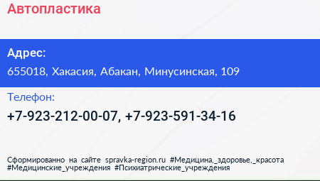 Автопластика по адресу 655018, Хакасия, Абакан, Минусинская, 109 в дальнейшем Организация, размещена в следующих категориях: