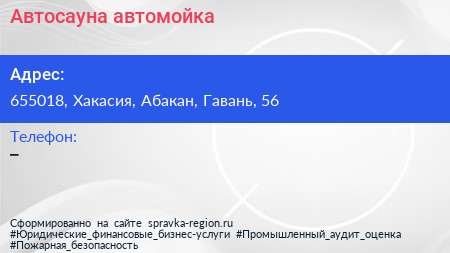 Автосауна, автомойка по адресу 655018, Хакасия, Абакан, Гавань, 56 в дальнейшем Организация, размещена в следующих категориях:
