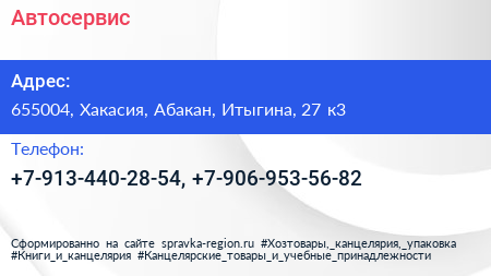 Автосервис по адресу 655004, Хакасия, Абакан, Итыгина, 27 к3 в дальнейшем Организация, размещена в следующих категориях: