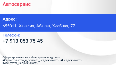Автосервис по адресу 655011, Хакасия, Абакан, Хлебная, 77 в дальнейшем Организация, размещена в следующих категориях: