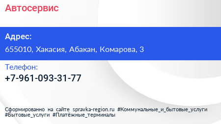 Автосервис по адресу 655010, Хакасия, Абакан, Комарова, 3 в дальнейшем Организация, размещена в следующих категориях: