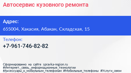 Автосервис кузовного ремонта по адресу 655004, Хакасия, Абакан, Складская, 15 в дальнейшем Организация, размещена в следующих категориях: