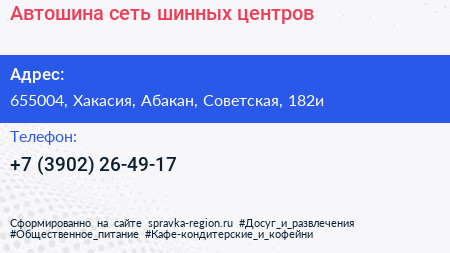Автошина, сеть шинных центров по адресу 655004, Хакасия, Абакан, Советская, 182и в дальнейшем Организация, размещена в следующих категориях: