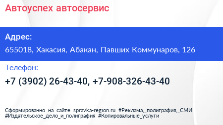 Автоуспех, автосервис по адресу 655018, Хакасия, Абакан, Павших Коммунаров, 126 в дальнейшем Организация, размещена в следующих категориях:
