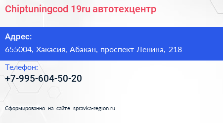 Chiptuningcod.19ru, автотехцентр по адресу 655004, Хакасия, Абакан, проспект Ленина, 218 в дальнейшем Организация, размещена в следующих категориях: