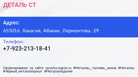 ДЕТАЛЬ-СТ по адресу 655016, Хакасия, Абакан, Лермонтова, 29 в дальнейшем Организация, размещена в следующих категориях: