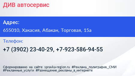ДИВ, автосервис по адресу 655010, Хакасия, Абакан, Торговая, 15а в дальнейшем Организация, размещена в следующих категориях: