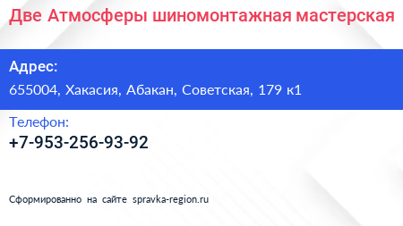 Две Атмосферы, шиномонтажная мастерская по адресу 655004, Хакасия, Абакан, Советская, 179 к1 в дальнейшем Организация, размещена в следующих категориях: