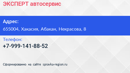 ЭКСПЕРТ, автосервис по адресу 655004, Хакасия, Абакан, Некрасова, 8 в дальнейшем Организация, размещена в следующих категориях: