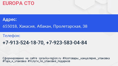 EUROPA, СТО по адресу 655018, Хакасия, Абакан, Пролетарская, 38 в дальнейшем Организация, размещена в следующих категориях: