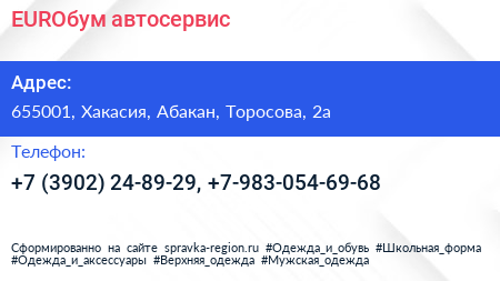 EUROбум, автосервис по адресу 655001, Хакасия, Абакан, Торосова, 2а в дальнейшем Организация, размещена в следующих категориях: