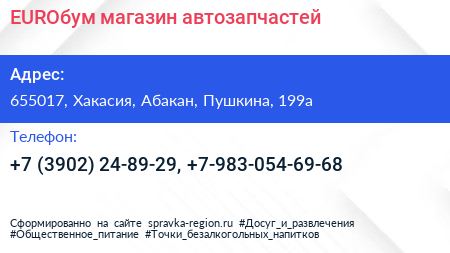 EUROбум, магазин автозапчастей по адресу 655017, Хакасия, Абакан, Пушкина, 199а в дальнейшем Организация, размещена в следующих категориях: