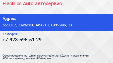 Electrics Auto, автосервис по адресу 655017, Хакасия, Абакан, Вяткина, 7а в дальнейшем Организация, размещена в следующих категориях:
