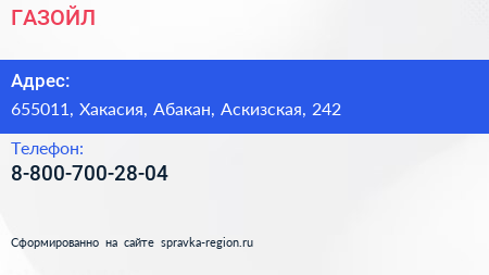 ГАЗОЙЛ по адресу 655011, Хакасия, Абакан, Аскизская, 242 в дальнейшем Организация, размещена в следующих категориях: