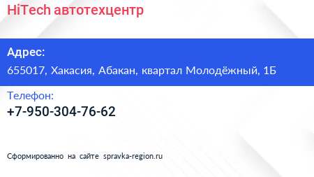HiTech, автотехцентр по адресу 655017, Хакасия, Абакан, квартал Молодёжный, 1Б в дальнейшем Организация, размещена в следующих категориях: