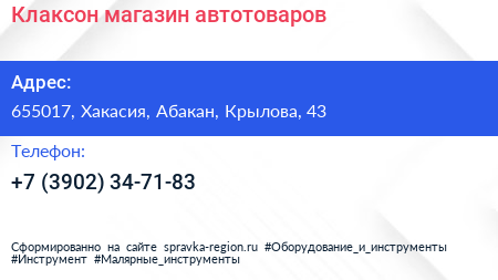 Клаксон, магазин автотоваров по адресу 655017, Хакасия, Абакан, Крылова, 43 в дальнейшем Организация, размещена в следующих категориях: