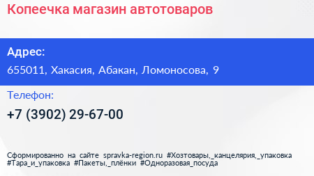 Копеечка, магазин автотоваров по адресу 655011, Хакасия, Абакан, Ломоносова, 9 в дальнейшем Организация, размещена в следующих категориях:
