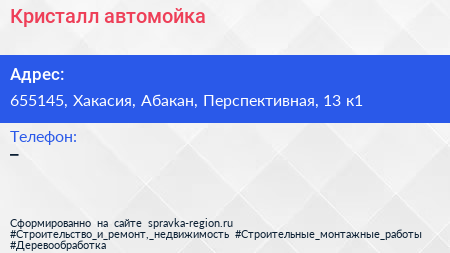 Кристалл, автомойка по адресу 655145, Хакасия, Абакан, Перспективная, 13 к1 в дальнейшем Организация, размещена в следующих категориях:
