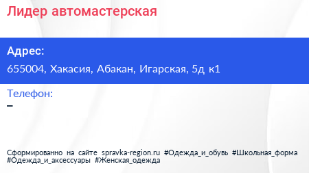 Лидер, автомастерская по адресу 655004, Хакасия, Абакан, Игарская, 5д к1 в дальнейшем Организация, размещена в следующих категориях: