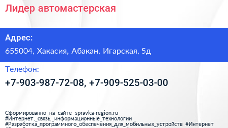Лидер, автомастерская по адресу 655004, Хакасия, Абакан, Игарская, 5д в дальнейшем Организация, размещена в следующих категориях: