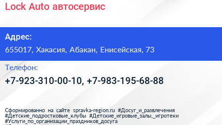 Lock Auto, автосервис по адресу 655017, Хакасия, Абакан, Енисейская, 73 в дальнейшем Организация, размещена в следующих категориях: