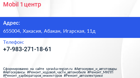 Mobil 1, центр по адресу 655004, Хакасия, Абакан, Игарская, 11д в дальнейшем Организация, размещена в следующих категориях: