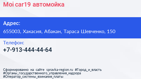Moi-car19, автомойка по адресу 655003, Хакасия, Абакан, Тараса Шевченко, 150 в дальнейшем Организация, размещена в следующих категориях: