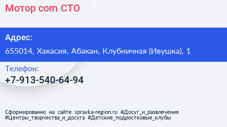 Мотор.com, СТО по адресу 655014, Хакасия, Абакан, Клубничная (Ивушка), 1 в дальнейшем Организация, размещена в следующих категориях: