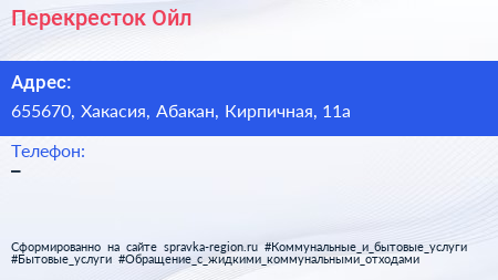 Перекресток Ойл по адресу 655670, Хакасия, Абакан, Кирпичная, 11а в дальнейшем Организация, размещена в следующих категориях: