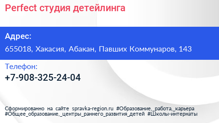 Perfect, студия детейлинга по адресу 655018, Хакасия, Абакан, Павших Коммунаров, 143 в дальнейшем Организация, размещена в следующих категориях:
