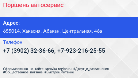 Поршень, автосервис по адресу 655014, Хакасия, Абакан, Центральная, 46а в дальнейшем Организация, размещена в следующих категориях: