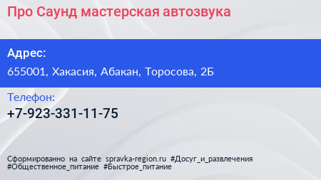 Про Саунд, мастерская автозвука по адресу 655001, Хакасия, Абакан, Торосова, 2Б в дальнейшем Организация, размещена в следующих категориях:
