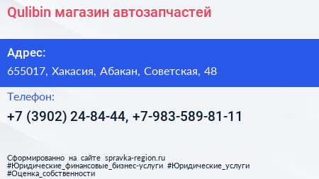 Qulibin, магазин автозапчастей по адресу 655017, Хакасия, Абакан, Советская, 48 в дальнейшем Организация, размещена в следующих категориях: