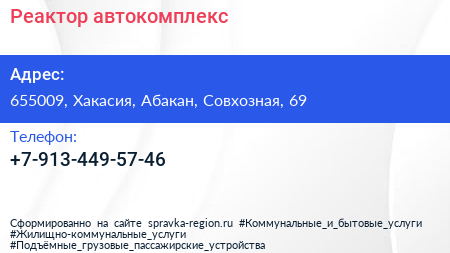 Реактор, автокомплекс по адресу 655009, Хакасия, Абакан, Совхозная, 69 в дальнейшем Организация, размещена в следующих категориях:
