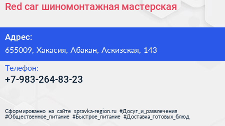 Red car, шиномонтажная мастерская по адресу 655009, Хакасия, Абакан, Аскизская, 143 в дальнейшем Организация, размещена в следующих категориях: