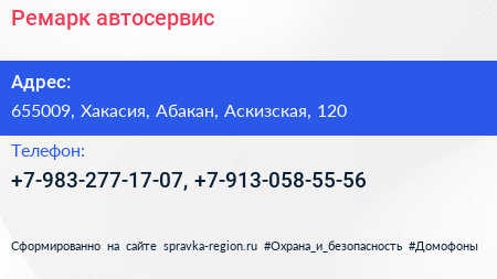 Ремарк, автосервис по адресу 655009, Хакасия, Абакан, Аскизская, 120 в дальнейшем Организация, размещена в следующих категориях: