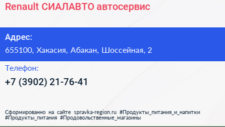 Renault СИАЛАВТО, автосервис по адресу 655100, Хакасия, Абакан, Шоссейная, 2 в дальнейшем Организация, размещена в следующих категориях: