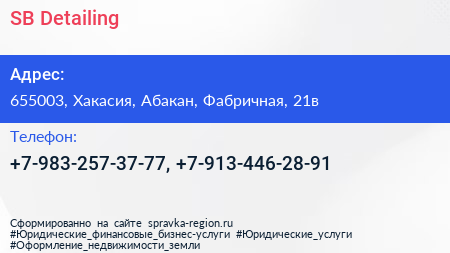 SB Detailing по адресу 655003, Хакасия, Абакан, Фабричная, 21в в дальнейшем Организация, размещена в следующих категориях: