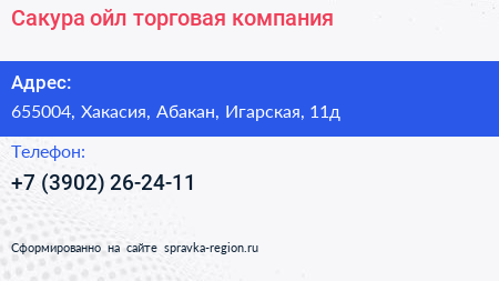 Сакура ойл, торговая компания по адресу 655004, Хакасия, Абакан, Игарская, 11д в дальнейшем Организация, размещена в следующих категориях: