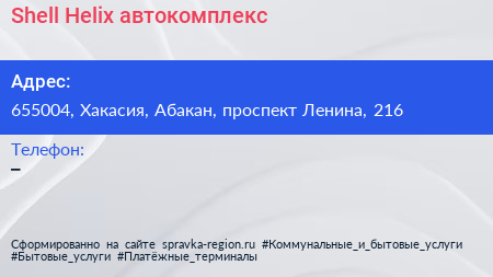Shell Helix, автокомплекс по адресу 655004, Хакасия, Абакан, проспект Ленина, 216 в дальнейшем Организация, размещена в следующих категориях: