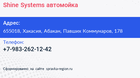 Shine Systems, автомойка по адресу 655018, Хакасия, Абакан, Павших Коммунаров, 178 в дальнейшем Организация, размещена в следующих категориях: